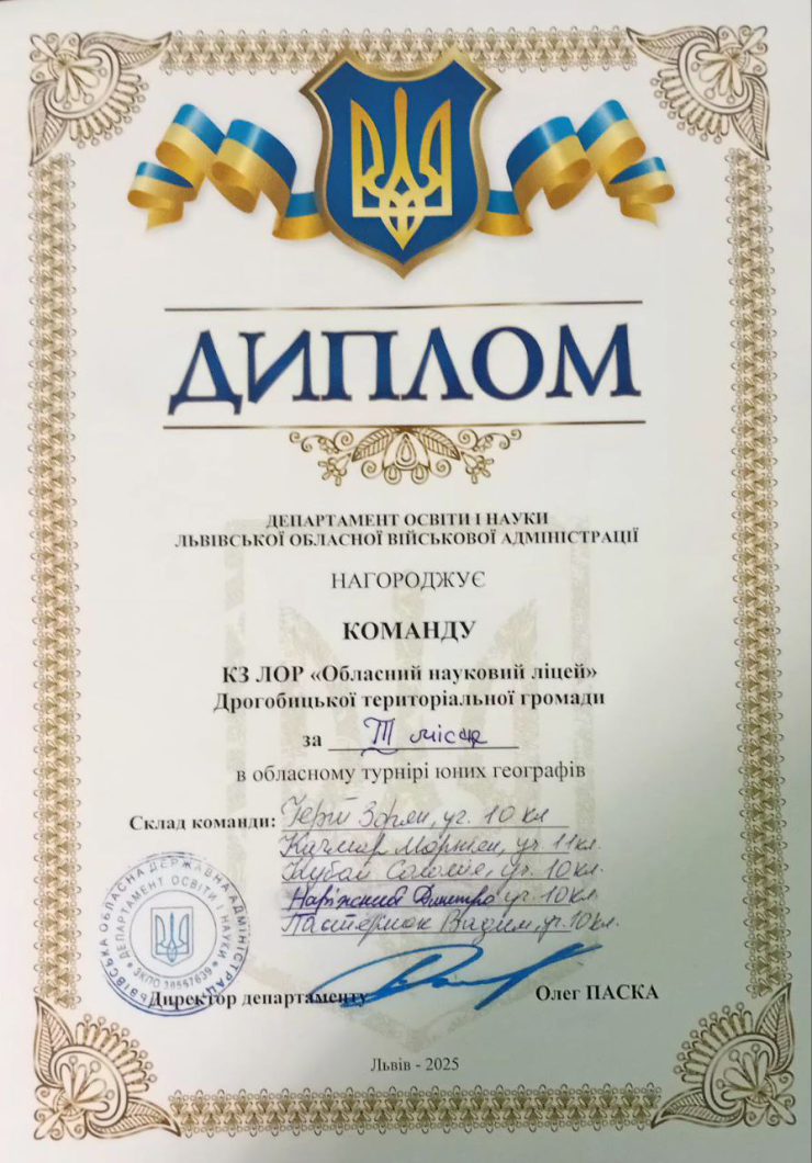 Команда КЗ ЛОР «Обласний науковий ліцей» у складі Герія Зоряна, Качмара Маркіяна, Кубай Соломії, Наріжного Дмитра, Пастернака Вадима під керівництвом вчителя географії Бецин Віталіни Петрівни  виборола III місце!