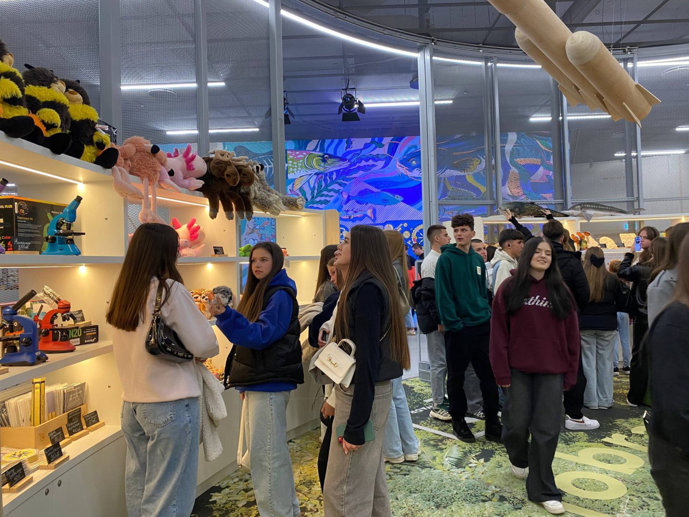 Ліцеїсти досліджували різноманітні експонати – від величезного резервуара з водою, що ілюструє водний цикл, до захопливих демонстрацій на великих сенсорних екранах, де обговорювали винаходи та майбутнє технологій.