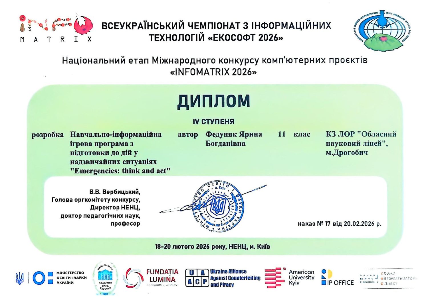 - Федуняк Ярина (11 клас) – нагороджена Дипломом IV ступеня за розробку навчально-інформаційної ігрової програми з підготовки до дій у надзвичайних ситуаціях «Emergencies: think and act».