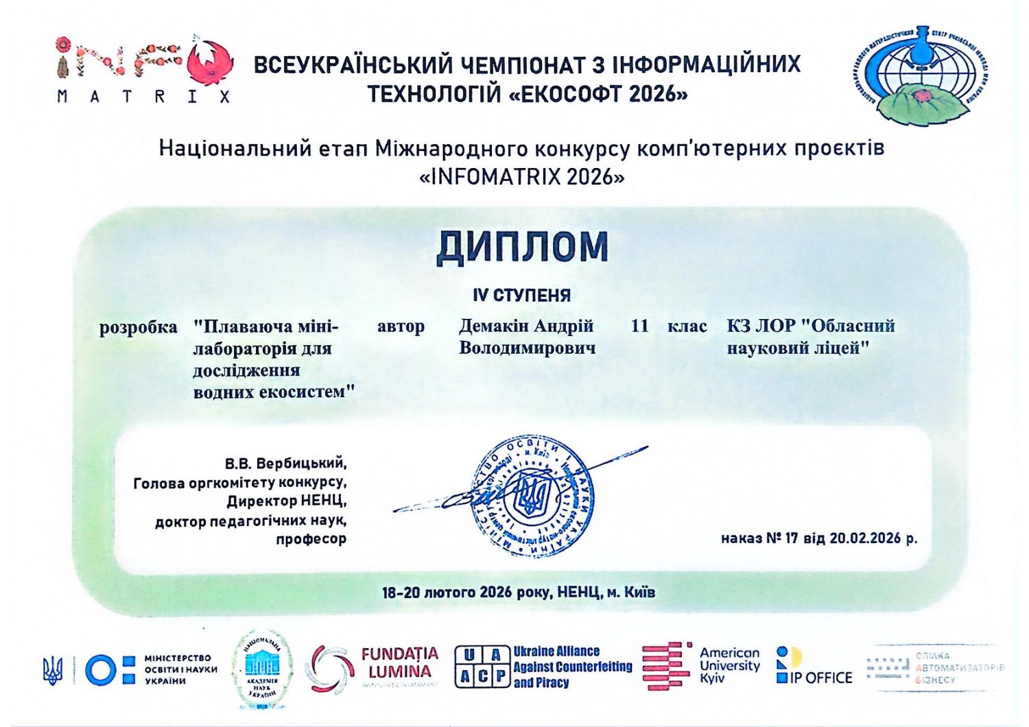 - Демакін Андрій (11 клас) – нагороджений Дипломом IV ступеня за проєкт «Плаваюча міні-лабораторія для дослідження водних екосистем».